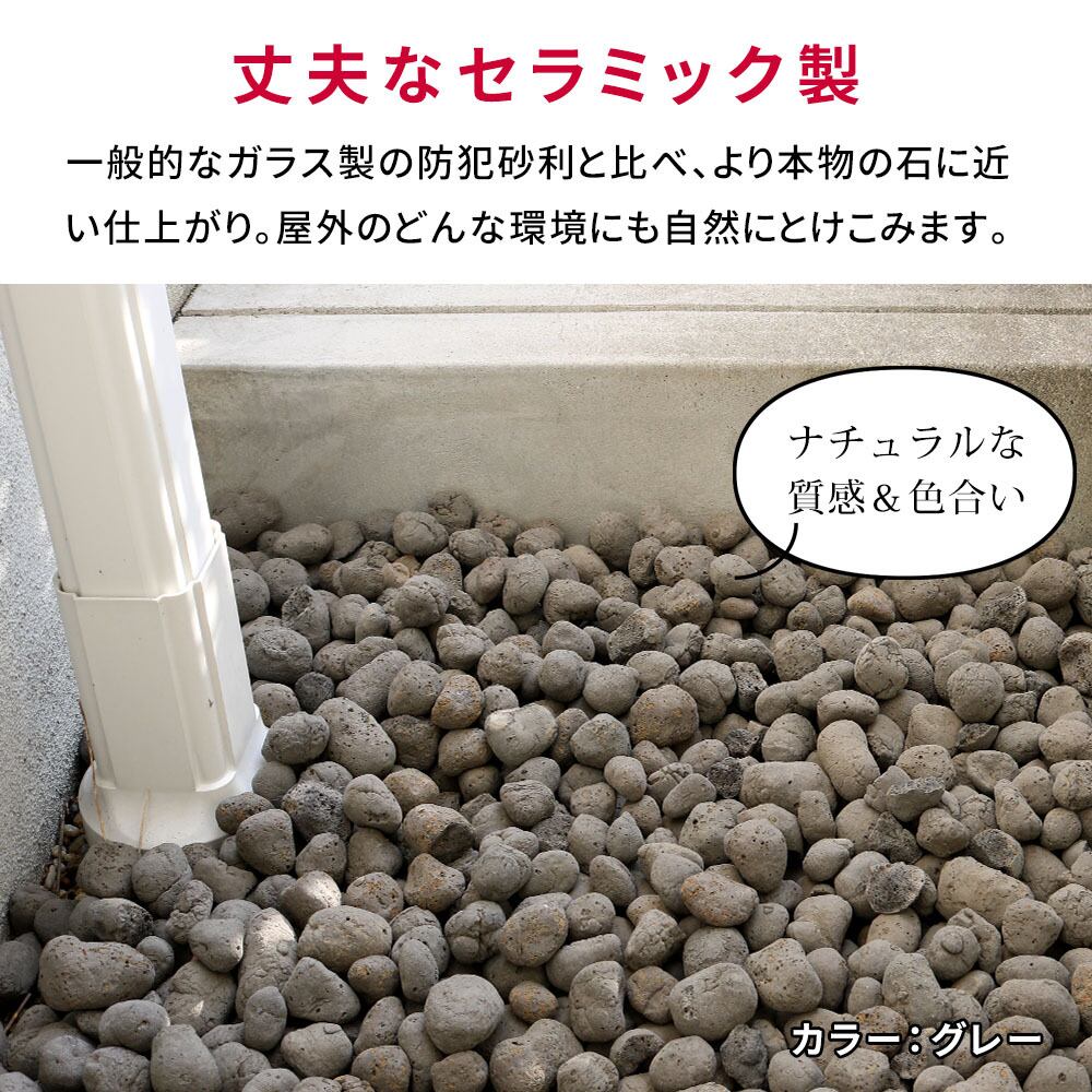 踏むと80dB(デシベル)以上の音が出ます。踏むと大きな音が出る砂利です。不審者を威嚇するだけでなく、「防犯意識の高い家」という印象を与えることができます。丈夫なセラミック製。一般的なガラス製の防犯砂利と比べ、より本物の石に近い仕上がり。屋外のどんな環境にも自然にとけこみます。防草対策にも。