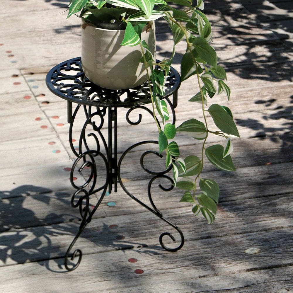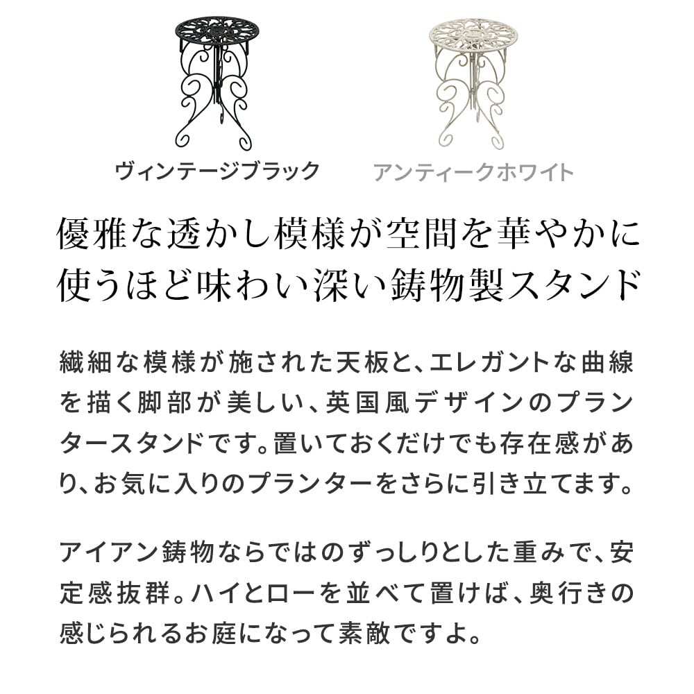 繊細な模様が施された天板と、エレガントな曲線を描く脚部が美しい、英国風デザインのプランタースタンドです。置いておくだけでも存在感があり、お気に入りのプランターをさらに引き立てます。