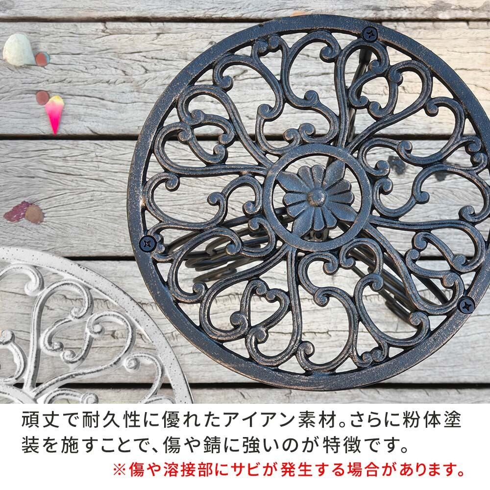 繊細な模様が施された天板と、エレガントな曲線を描く脚部が美しい、英国風デザインのプランタースタンドです。置いておくだけでも存在感があり、お気に入りのプランターをさらに引き立てます。
