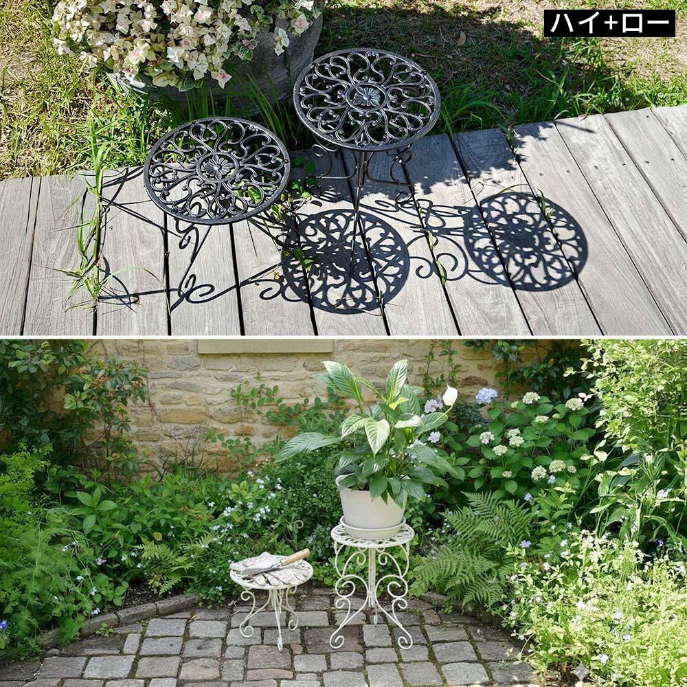 アイアン鋳物ならではのずっしりとした重みで、安定感抜群。ハイとローを並べて置けば、奥行きの感じられるお庭になって素敵ですよ。