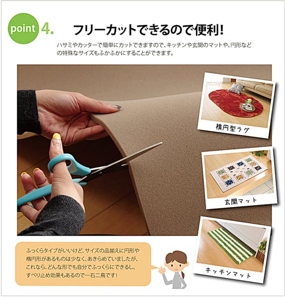 また本商品は簡単にハサミでカット出来るフリーカットタイプですので、お手持ちのカーペットの大きさに合わせることが可能です。