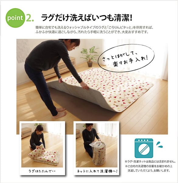 洗濯機丸洗いが出来る薄手のカーペットと併用すると(1)表のカーペットは洗えて清潔に使用できる。(2)ウレタン10mmのボリューム、クッション性。(3)フローリングで使用しても滑りにくい。と3拍子揃います。