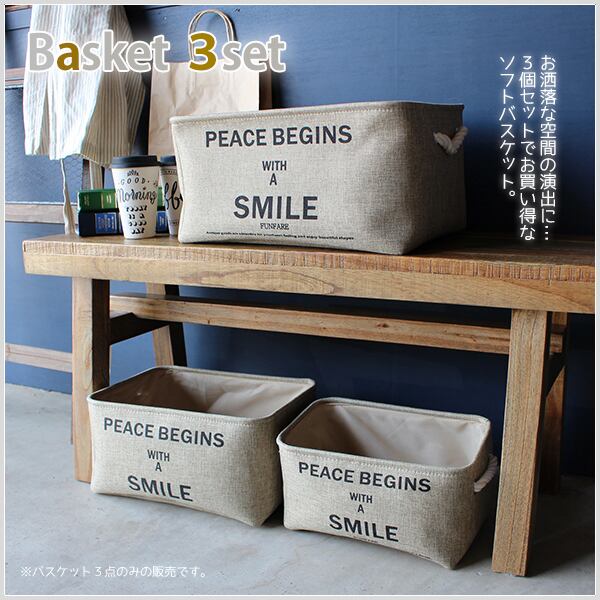 バスケット 3個セット ソフトバスケット角型BE おしゃれ 収納 ランドリーカゴ ランドリーバッグ 西海岸風 脱衣かご 小物入れ かわいい AKSET-09BE