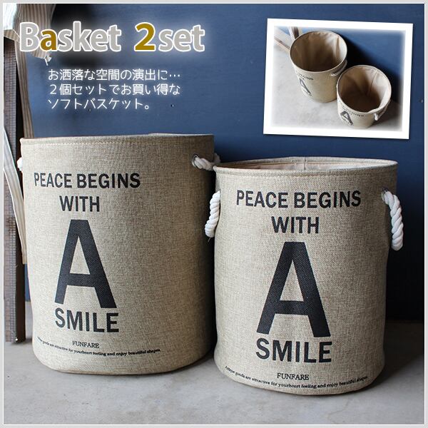 バスケット 2個セット ソフトバスケット丸型BE おしゃれ 収納 ランドリーカゴ ランドリーバッグ 西海岸風 脱衣かご 小物入れ かわいい AKSET-11BE