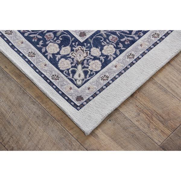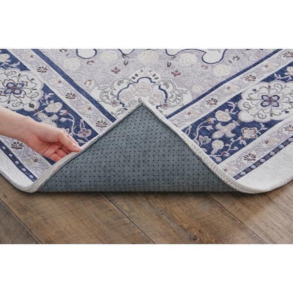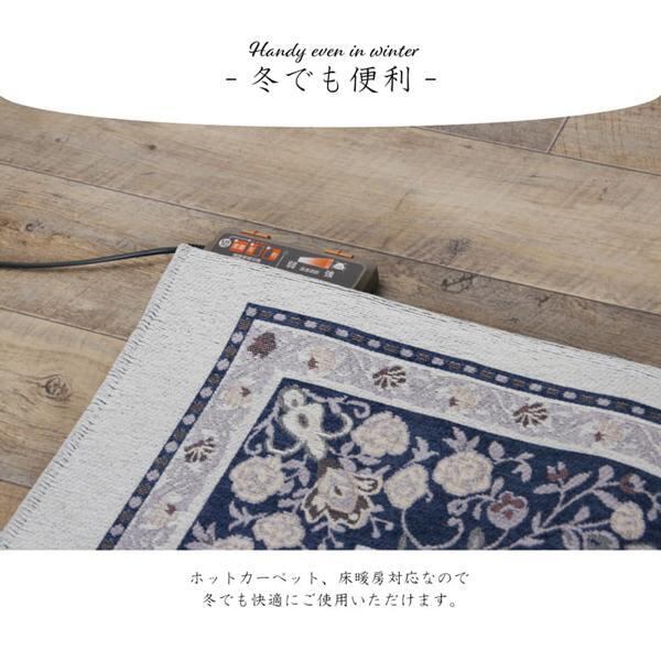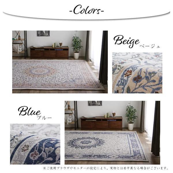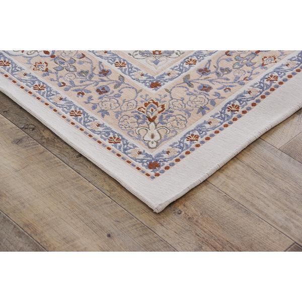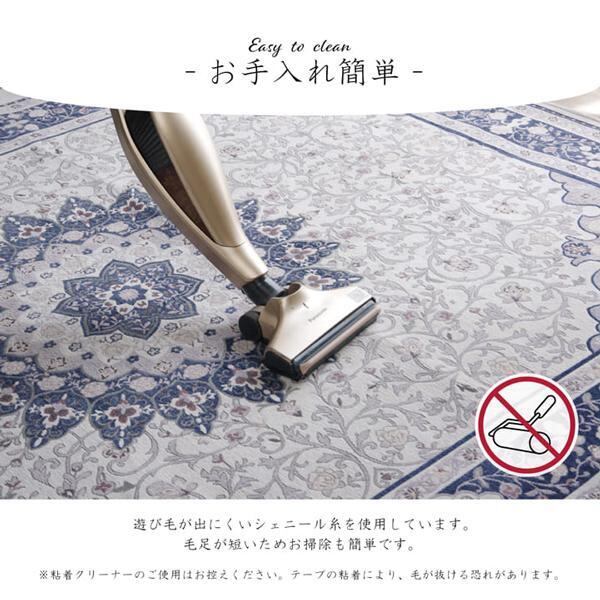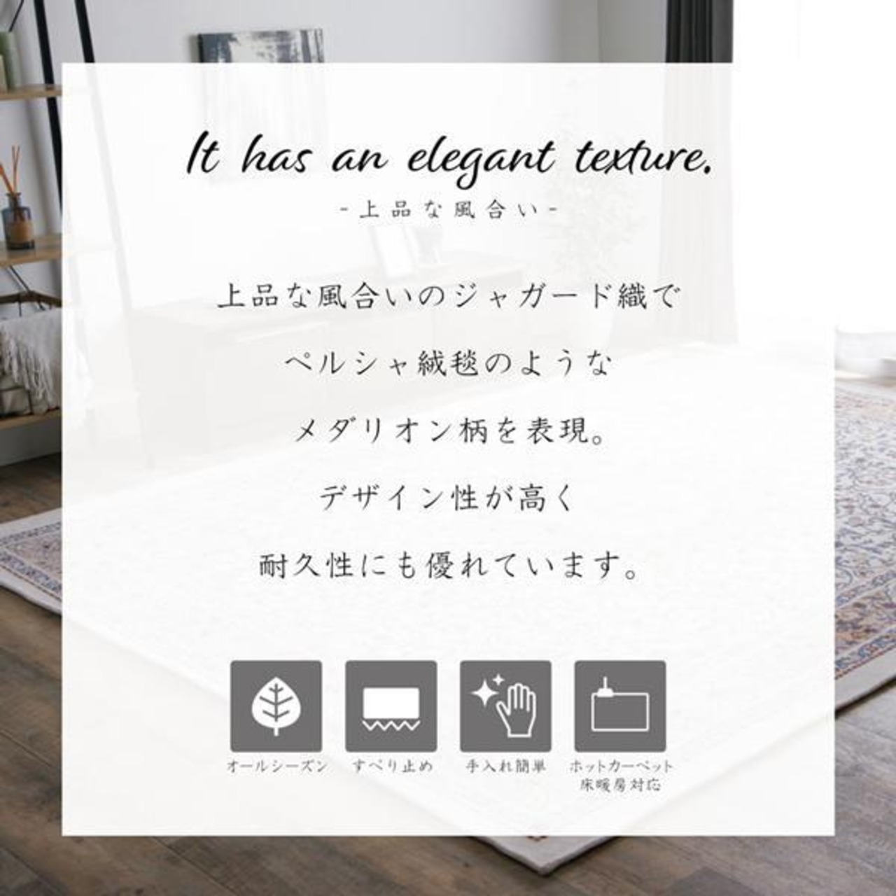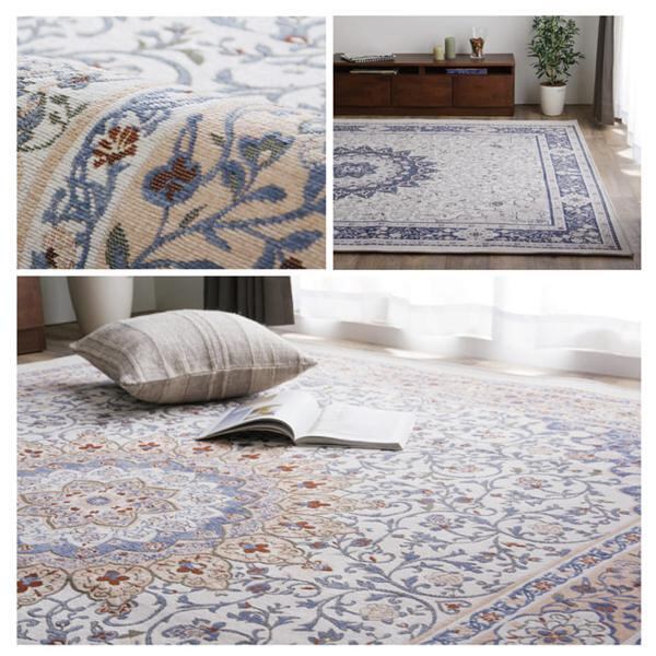 遊び毛が出にくいシェニール糸を使用しています。毛足が短いためお掃除も簡単です。上品な風合いのジャガード織りで、ペルシャ絨毯のようなメダリオン柄を表現。デザイン性が高く、耐久性にも優れています。さらっとした肌触りで季節を問わず一年中お使いいただけます。裏面はフローリングを傷つけにくい不織布張り。滑り止め加工も施しています。ホットカーペット、床暖房対応。