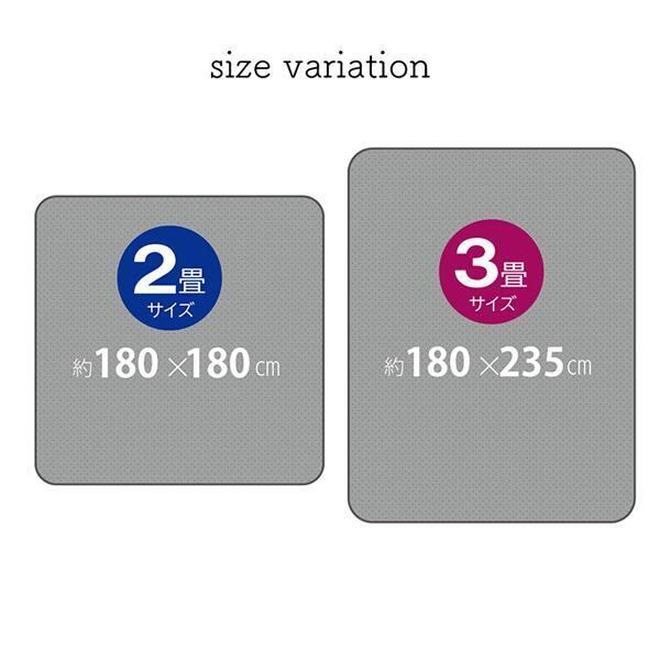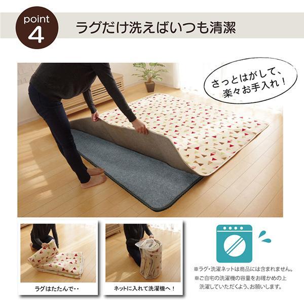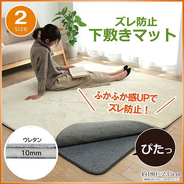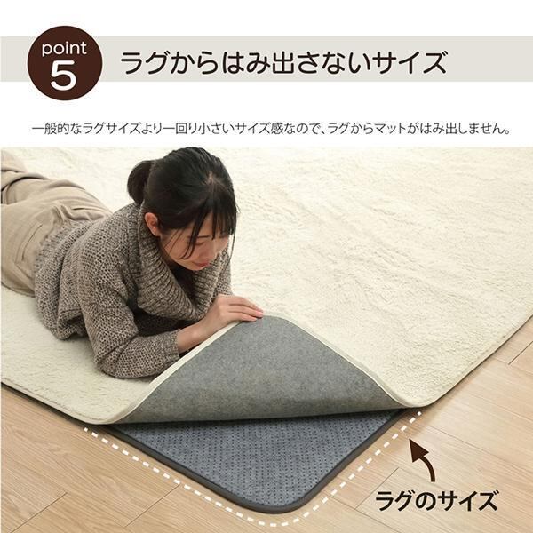 お使いのラグの下に敷くだけで,厚み・クッション性を持たせることができる下敷きラグです。表・裏の両面に滑りにくい加工を施しているため,ラグがズレにくく快適です。中材に厚み10mmのウレタンフォームを使用しているため,薄いラグの底付き感にクッション性をプラスできます。ホットカーペットにも対応しています。