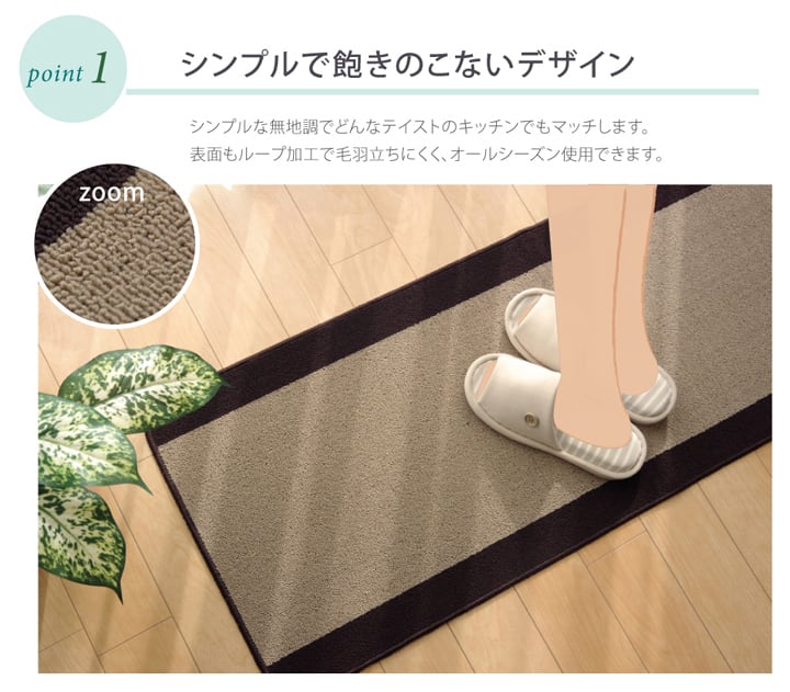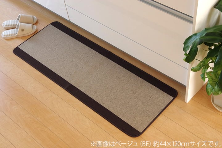 シンプルな無地のキッチンマットです。あえて厚さを薄め(約7mm)にすることにより、システムキッチンでも引っかかりにくい仕様にしています。裏面には滑りにくい加工を施しています。ご家庭の洗濯機で洗えます(ネット使用)ので、清潔にご使用頂けます。