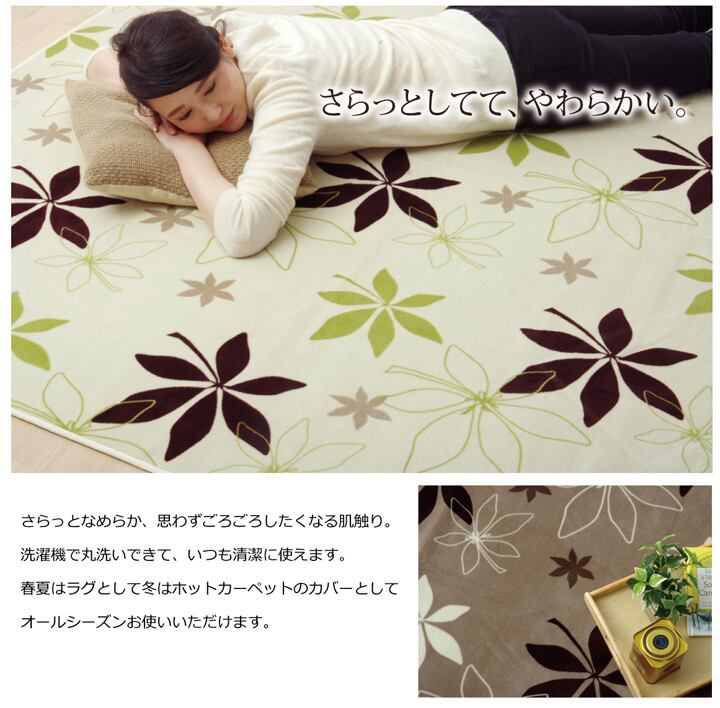 生地に抗菌・防臭加工を施した、ラグカーペットです。表地にはフランネルと呼ばれる、しっとりとして非常に柔らかい生地を使用しています。軽量で持ち運びが楽々です。薄手で小さく折りたたむことができますので、収納時にも場所を取りません。フローリングを傷つけにくいよう、裏には不織布を貼っています。ご家庭の洗濯機で洗えるウォッシャブル仕様ですので、清潔にご使用頂けます。電気カーペットカバーとしてもご使用頂けます。季節を選ばすオールシーズンご使用頂けます。