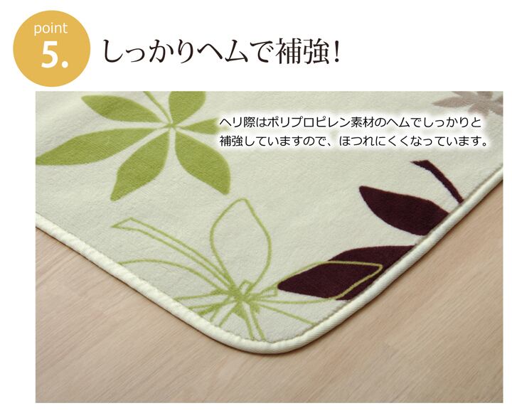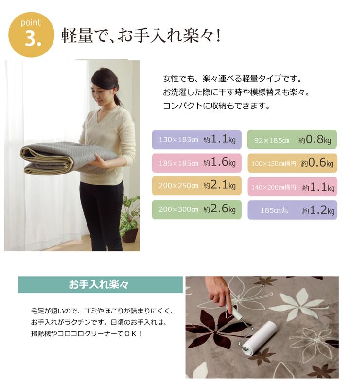 生地に抗菌・防臭加工を施した、ラグカーペットです。表地にはフランネルと呼ばれる、しっとりとして非常に柔らかい生地を使用しています。軽量で持ち運びが楽々です。薄手で小さく折りたたむことができますので、収納時にも場所を取りません。フローリングを傷つけにくいよう、裏には不織布を貼っています。ご家庭の洗濯機で洗えるウォッシャブル仕様ですので、清潔にご使用頂けます。電気カーペットカバーとしてもご使用頂けます。季節を選ばすオールシーズンご使用頂けます。